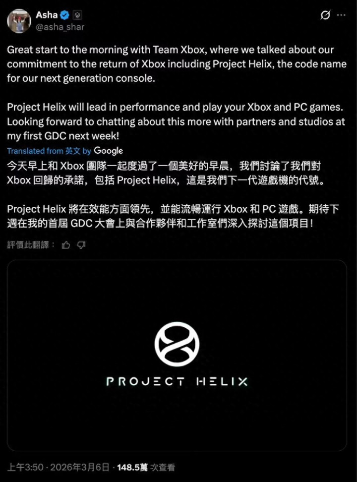 DoNews3月6日音书,微软 Xbox 部门新掌舵东说念主阿莎 · 夏尔玛(Asha Sharma)5 日在 X 平台示意,公司里面也曾在征询下一代 Xbox 主机“Project Helix”。