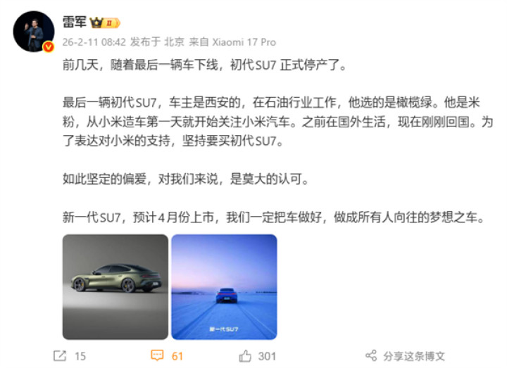 这款让小米淡雅踏入造车赛谈的车型,就此完成历史责任。终末一台车将在近期委派到车主手中,届时初代SU7将绝对成为“绝版”。