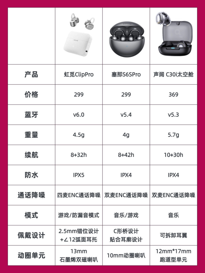 耳夹式耳机如今越来越受接待,使用东谈主群束缚加多,以至有从容替代中听式的趋势。它无须塞耳谈,捎带稳定透气,久戴不闷胀。不外市面上居品性量互异大,许多东谈主选购时拿不准。今天我带来虹觅Clip Pro、塞那S6SPro、声阔C30i三款热点机型实测,连合真确使用体验,帮你理清选购的标的。