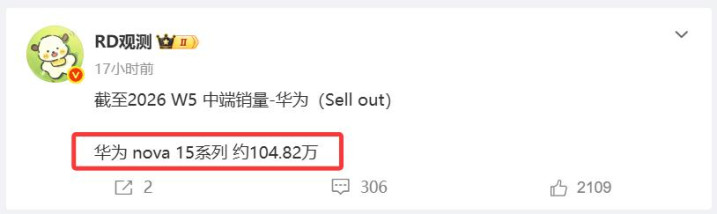 笔据着名博主“RD不雅测”近期发布的数据,抑遏2026年第五周(W5),nova15系列的累计销量如故达到了接近105万台,置身“百万俱乐部”。