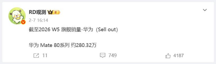 比nova15系列早一个月发布的Mate80系列,抑遏2026年第五周的销量如故达到了280万台支配,在同时发布的国产旗舰中,仅次于小米17系列(353万台支配)。