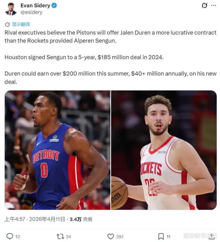 据福布斯体育记者Evan Sidery报谈,活塞内线杰伦-杜伦在今夏有望赢得5年跳跃2亿好意思元的新合同,均薪达到4000万好意思元以上。Evan Sidery暗示,定约多半认为,活塞给杜伦的合同会高于2024年火箭给申京的合同(5年1.85亿)。