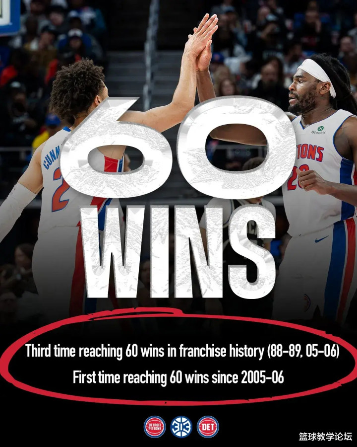 活塞上一次拿到60胜,还要追想到2005-06赛季,距今整整20年。其时活塞一谈打到东决,临了被热火4-2淘汰。活塞队史一共3次斩获60胜:1988-89赛季(63胜19负),2005-06赛季(64胜18负),2025-26赛季(60胜22负)。