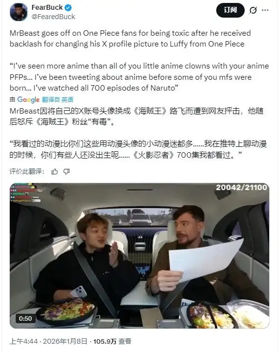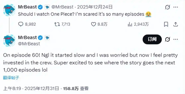 2025年12月,MrBeast在X(推特)发了一条帖子:“我该不该看《帆海王》?”