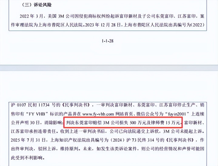2023年至2025年,富印新材营收从5.35亿元稳步增至7.59亿元。但与营收弧线并行的,还有一段与天下胶粘剂巨头3M握续多年的法律纠葛——2025年7月,公司商标侵权案终审败诉,被判向3M抵偿吃亏及讼师费共计515万元。此外,3M已进一步针对其产物OCA光学胶、丙烯酸泡沫胶拿起专利侵权诉讼,现在该案仍未公布具体细节。