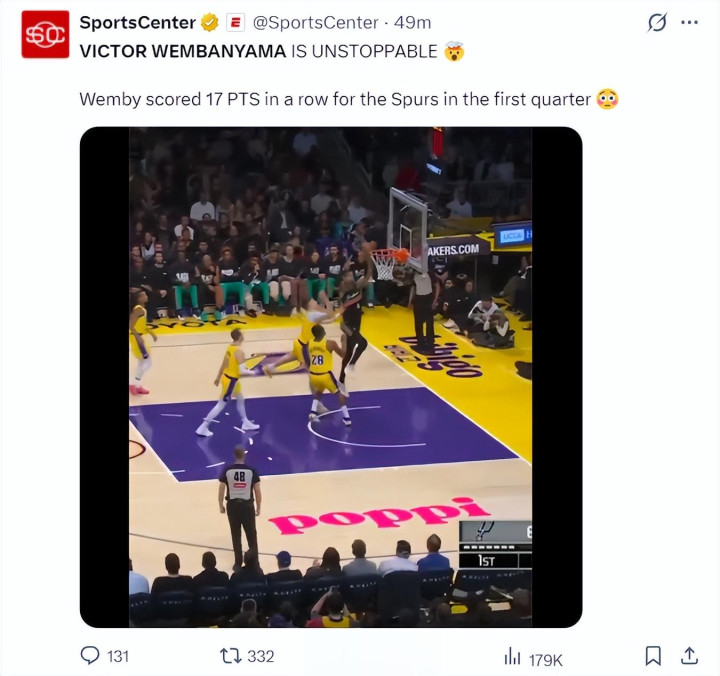 首节开场文班亚马就启动演出饰演秀,回身过掉拉拉维亚胜利单手劈扣,开场5中5,三分3中3拿到17分。