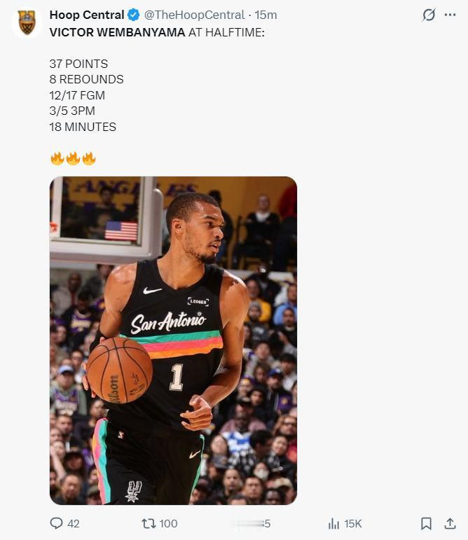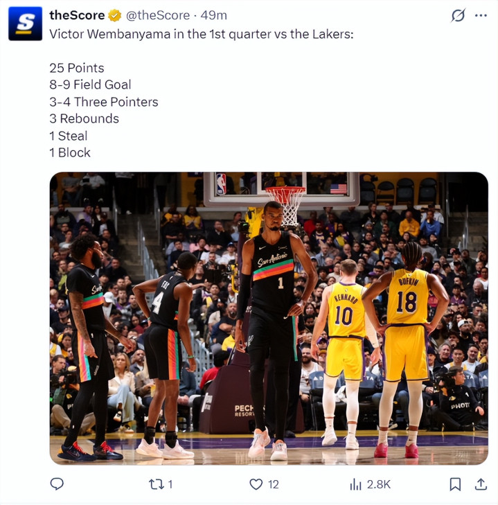 北京时期2月11日,NBA老例赛,马刺大捷湖东说念主。这场比跑马刺球星文班亚马阐明止境出色,首节8分钟里就拿到25分,半场18分钟拿到37分,三节26分钟拿40+12,文班亚马早早打卡放工。