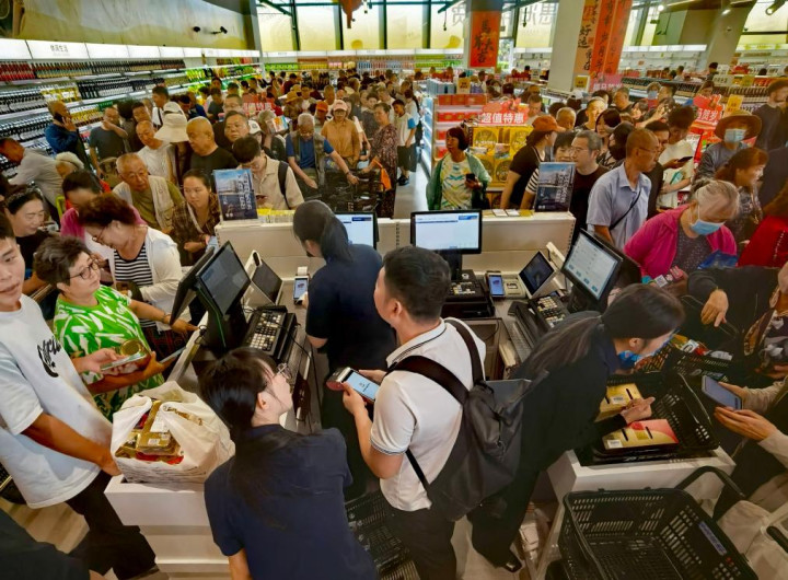 开业后,店内东谈主头攒动,消耗者推着购物车安身挑选,收银台队伍不停蔓延,进口处仍有市民络续涌入。