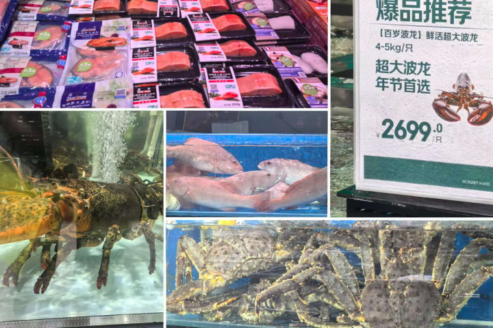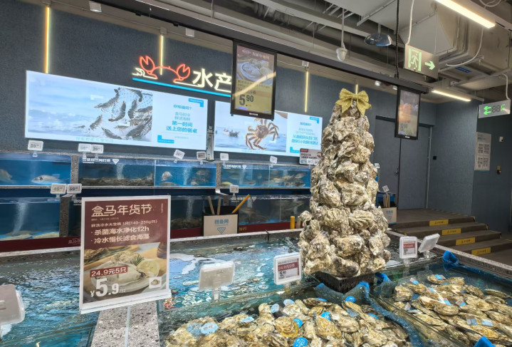 2月8日,在房山区盒马门店,水产区贴出东星斑、君王蟹、波士顿龙虾等宣传图,一旁的生蚝壳堆叠成塔。责任主谈主员称,这两周前来购买高端水产的东谈主昭着变多,还有东谈主沟通能不成除夕本日来买,“除夕要尽早来,这类食材很紧俏,如果要的量很大,建议提前相通。”