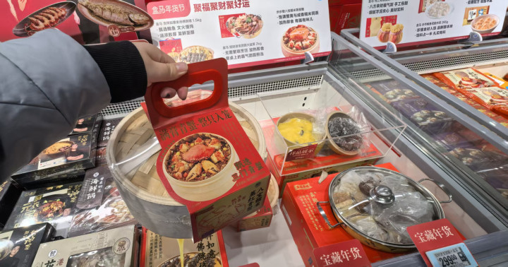 “雇主,我想要一个500元阁下的海鲜礼盒,合适送父老的。”2月7日,在北京市丰台区一家水产店,市民宋女士正在置办水产年货。摊主从冷柜中取出多款预包装食材:“一份八头(指每公斤约莫有8只虾)黑虎虾,一袋即食海参,还有两条一斤装的冻黄花鱼,你再搭点别的,礼盒免费给你装,拎着就走。”