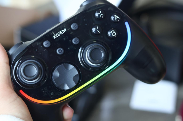 西圣 GC1 的包装挺朴实,莫得花里胡梢的电竞风,绽放便是嵌在模具里的玄色手柄,千里稳又低调。但开机斯须我就被惊艳到了 —— 后头的 RGB 灯带亮起,10 种灯效不错通过稳重按键切换,亮度还能篡改,更阑玩游戏时氛围感径直拉满,放在桌面当摆件齐不违和。