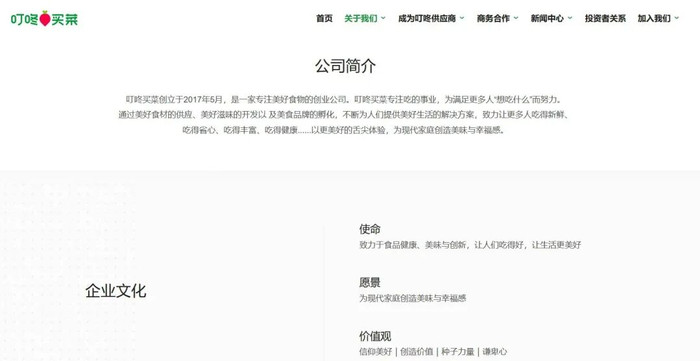 按照官网的表述,叮咚买菜对自身的定位是“专注好意思好食物的创业公司”。“专注吃的劳动,为昂扬更多东谈主‘想吃什么’而勤勉。通过好意思好食材的供应、好意思好味谈的征战以及好意思食物牌的孵化,持续为东谈主们提供好意思好生活的治理决议,竭力于让更多东谈主吃得崭新、吃得省心、吃得丰富、吃得健康。”