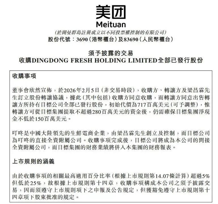 2月5日晚间,好意思团晓谕以约7.17亿好意思元的运行对价收购叮咚买菜中国业务的一起已刊行股份。凭据公告,叮咚买菜外洋业务不在这次往复范围内,筹画在交割前完成剥离。