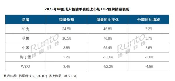 成东谈主智高腕表方面,2025年中国成东谈主智高腕表线上市集的销量为2134.1万台,同比增长15.6%;销售额为244.8亿元,同比增长50.8%。平均价钱为1147元。华为以24.5%的销量份额稳居市集榜首,全年同比大涨46.8%,份额较2024年赞助5.2个百分点;苹果位列线上市集的销量第二,份额为16.5%,同比赞助了5.7个百分点;小米的销量份额为8.8%,位列第三。