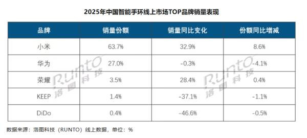 此外,中国智高手环线上市集的销量为1229.8万台,同比增长14.9%,销售额为37.7亿元,同比增长25.8%。平均价钱为307元。小米和华为的经营销量份额达到生分的90.7%,较客岁同时增长4.5个百分点。其中,小米以63.7%的销量份额稳居线上市集的第一,小米手环10成为销量增长的中枢能源,在品牌里面占据了35.6%的市集份额。