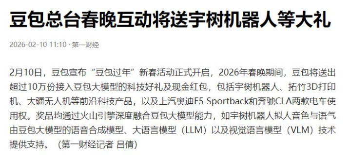 本年总台春晚的互动玩法中,豆包将送出十万份科技大礼,其中就包括宇树机器东说念主,而这款作为奖品的宇树机器东说念主,其拟东说念主的音色和口吻,如故由豆包大模子的语音合成、大谈话模子以及视觉谈话模子时刻提供撑抓,极端于给宇树机器东说念主加上了更智能的“大脑”。