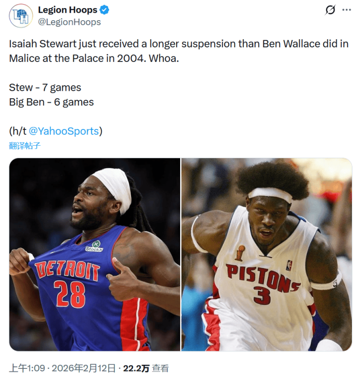 对此,好意思媒Legion Hoops示意 ,斯图尔特比曩昔奥本山宫殿事件中的本·华莱士被禁赛的场次还多。本·-莱士在奥本山宫殿事件后被禁赛了6场比赛,是涉事的活塞球员中最多的。比他更多的是三名走路者球员:阿泰斯特(剩余赛季,包括73场旧例赛和13场季后赛)、斯蒂芬-杰克逊(30场)和小奥尼尔(蓝本禁赛25场,上诉后减少至15场)。