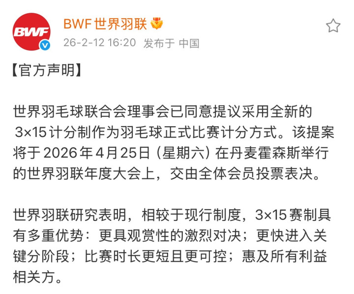 虎扑02月12日讯2026年2月12日,宇宙羽毛球聚积会(BWF)通过官方渠说念发布声明,通知理事会已承诺冷落选拔全新的3×15计分制当作羽毛球阐扬比赛的计分容貌。这一要紧篡改提案将于2026年4月25日,在丹麦霍森斯举行的宇宙羽联年度大会上,交由整体会员投票表决。