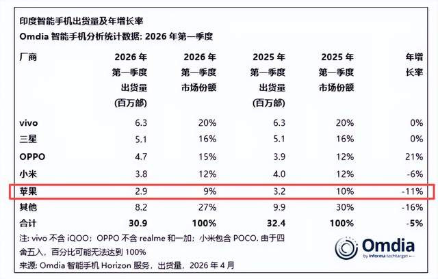 而2026年一季度,苹果在印度的销量亦然290万台的口头,份额为9%,排在第五名,还下滑了11%,份额还跌了一个百分点。